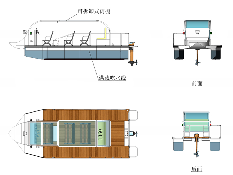 1、Dimensions (L×W×H, mm): 4900×2500×1480 (excluding bow, stern and 400 mm waterline draft)
