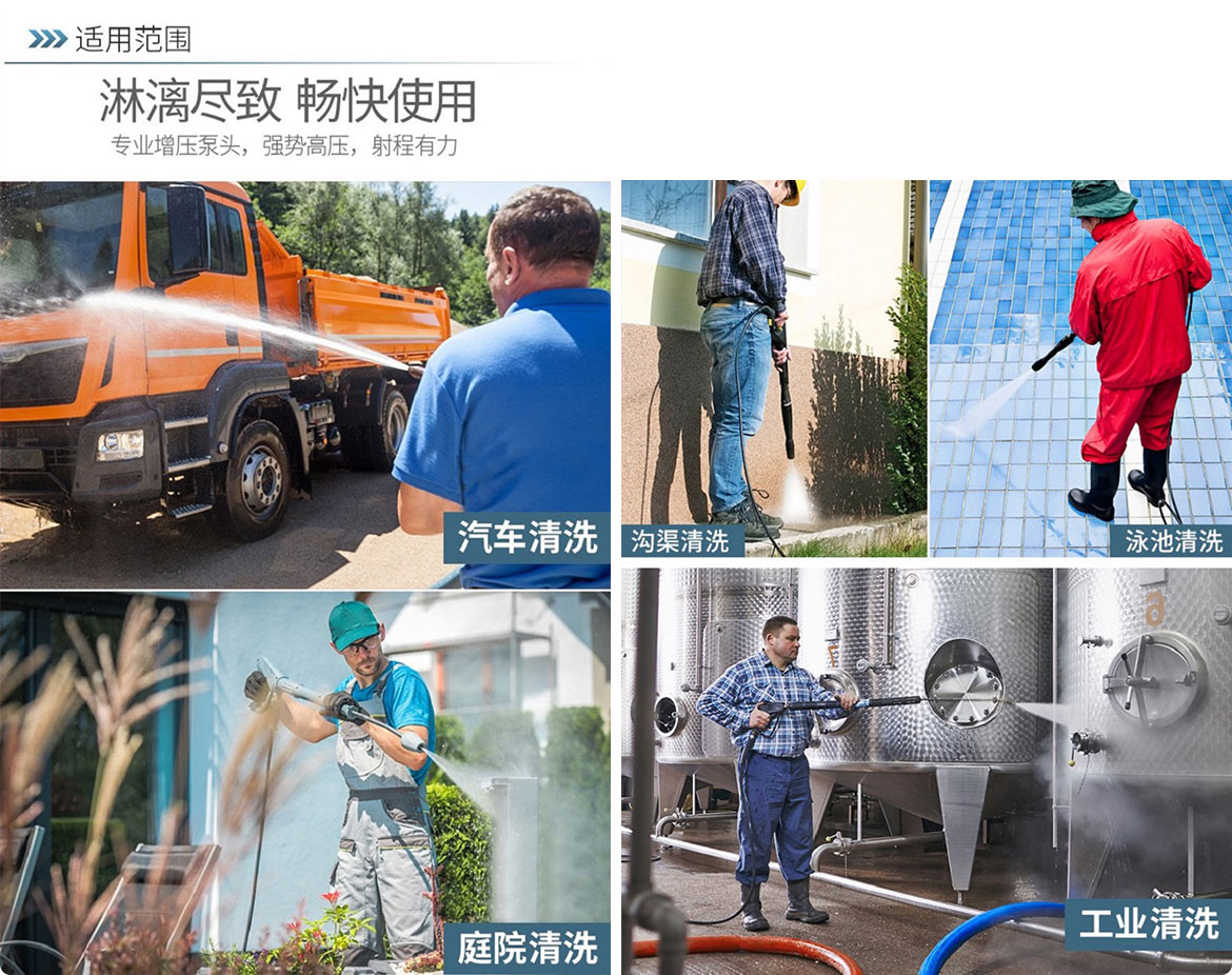 1. Cleaning and maintenance of engineering vehicles and automobiles; 2. Road line removal and sanitation pavement flushing in the highway industry; 3. Surface cleaning of building exterior walls with small advertisements, ground surfaces, swimming pools and other places; 4. Pipeline dredging for municipal authorities, property management companies, factory areas and parks. With its powerful water pressure, the high-pressure cleaner can effectively remove impurities on pipe walls and dredge pipelines with extremely high efficiency. It has now become the preferred choice for many municipal sanitation departments and petrochemical plants.